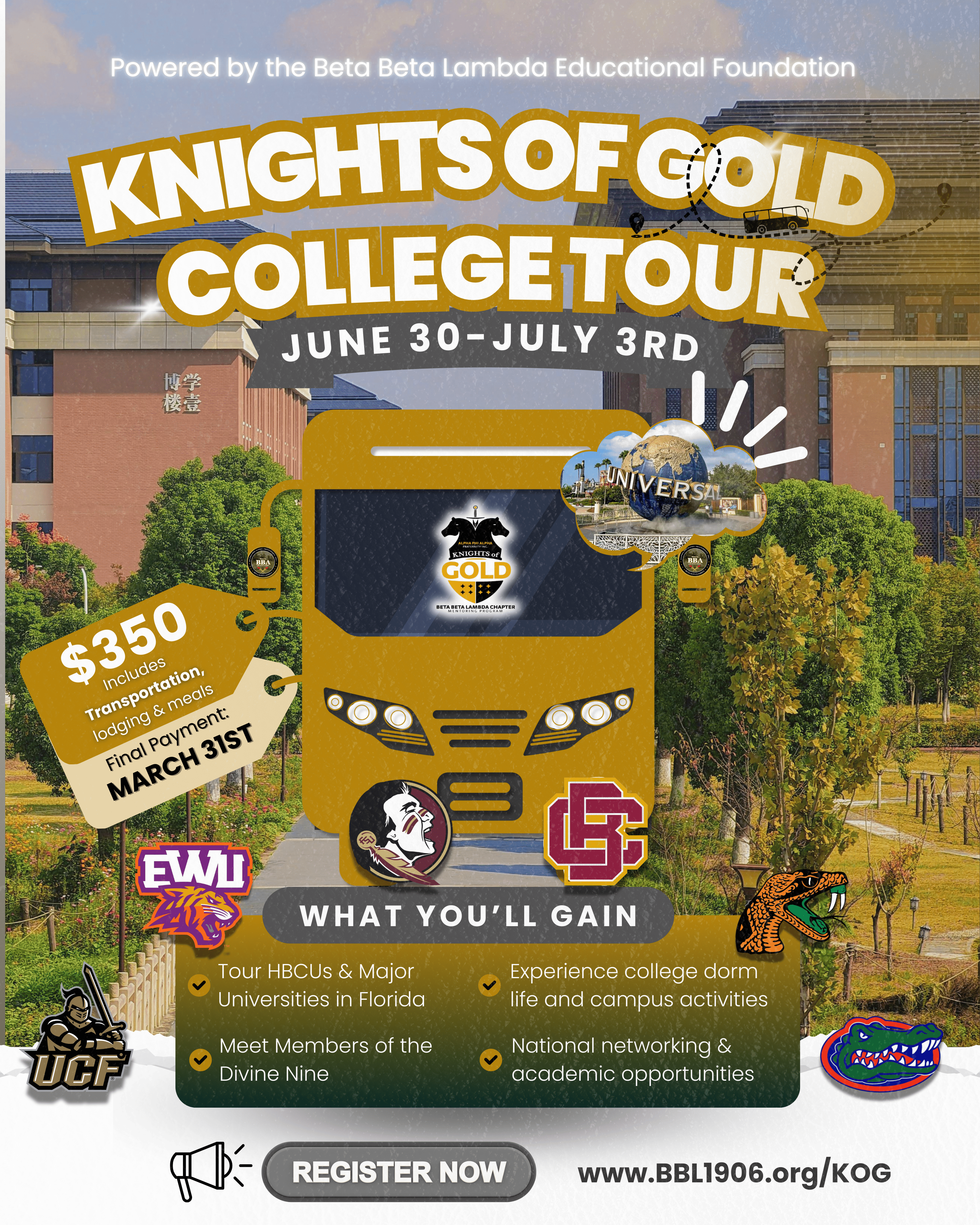 The Knights of Gold Mentoring Program was created to support the implementation of the Beta Beta Lambda chapter of Alpha Phi Alpha's "Go-To-High-School, Go-To-College" national program. Spearheaded by its founder James Gay in 1975 and revived in 2010 by brother Anderson Elridge and the "A-team" the program ensured that young men have access to positive role models, structured guidance, and real world exposure that expands their vision for the future.
